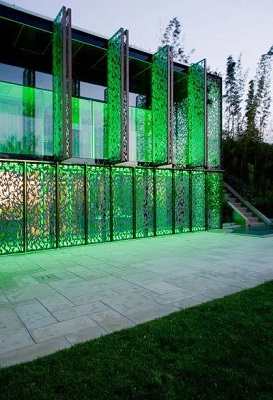豪宅外侧采用玻璃结构,加上精心雕刻的镂空图案,与周围的绿植呼应,
