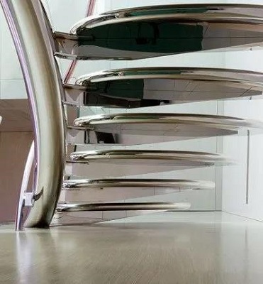 别致的钢制楼梯,与旁边的纯白色餐桌、透明餐椅形成鲜明的对比。