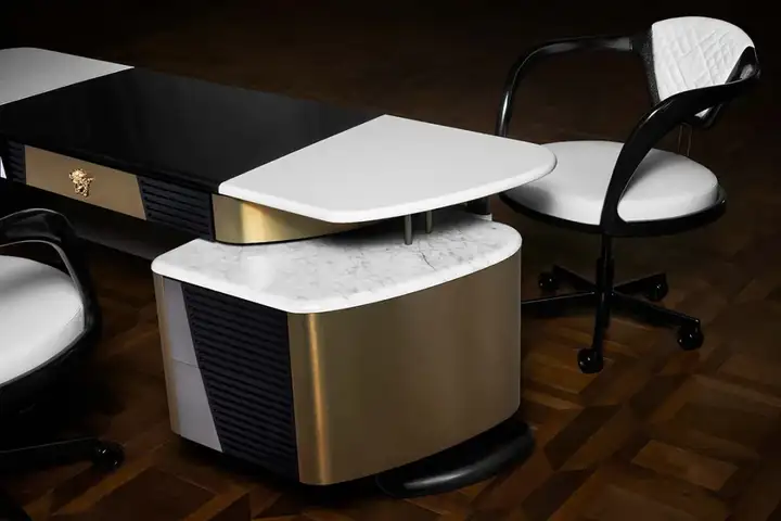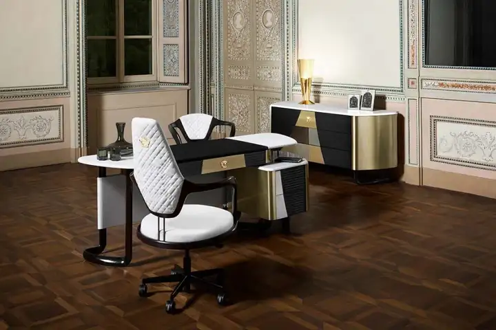 THE MEDUSA系列将独特美学带到办公室,醒目夸张的办公系列由染色的白蜡木制成,配有皮革装饰和标志性的金色美杜莎标志的桌椅,象征着VERSACE创意国度的经典神话女神,为工作空间注入华丽气息。