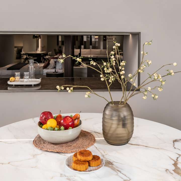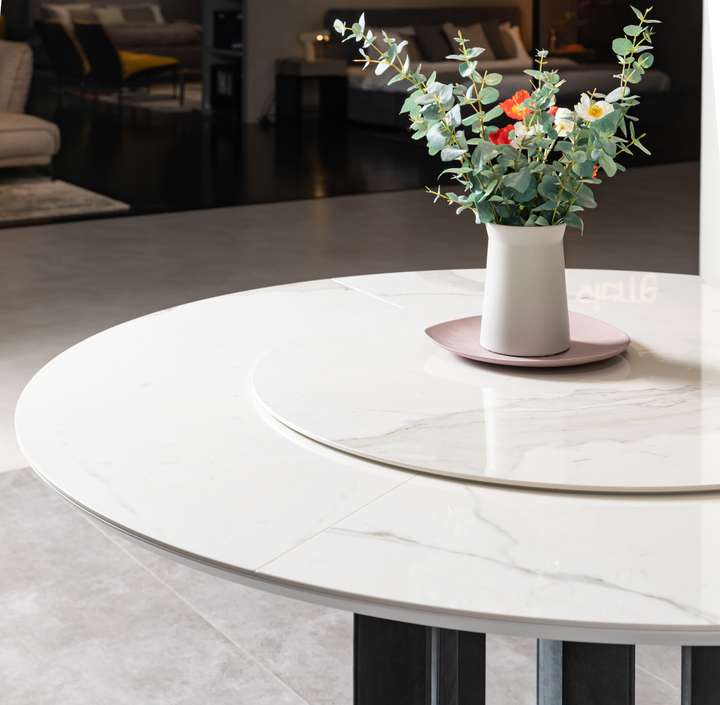 VORTEX系列餐桌,白色亚光陶瓷台面,旋涡状金属底座,优雅独特的小蛮腰设计。圆弧线条与空间直线彼此呼应,描绘客厅温馨格调,摩登感与实用功能并重。