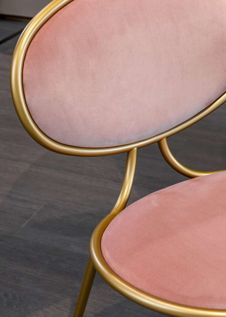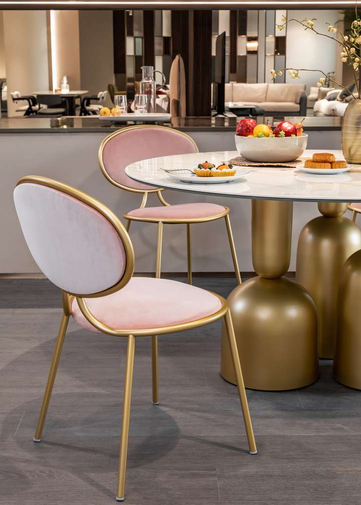 OTTO系列餐椅为金属结构外镀黄铜色金属烤漆,优雅复古的设计,加上一如既往舒适软包,高密度的泡棉包覆臀部,坐感舒适。