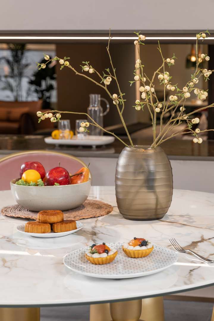 干净清爽的米白色餐桌,是餐厅的最佳素色打底,让美食更显诱人好色泽。搭配清爽的湖蓝色餐椅,仿佛吹入餐厅的舒缓微风,用餐亦成为一天中最减压的时光。
