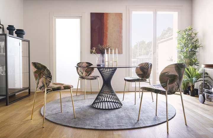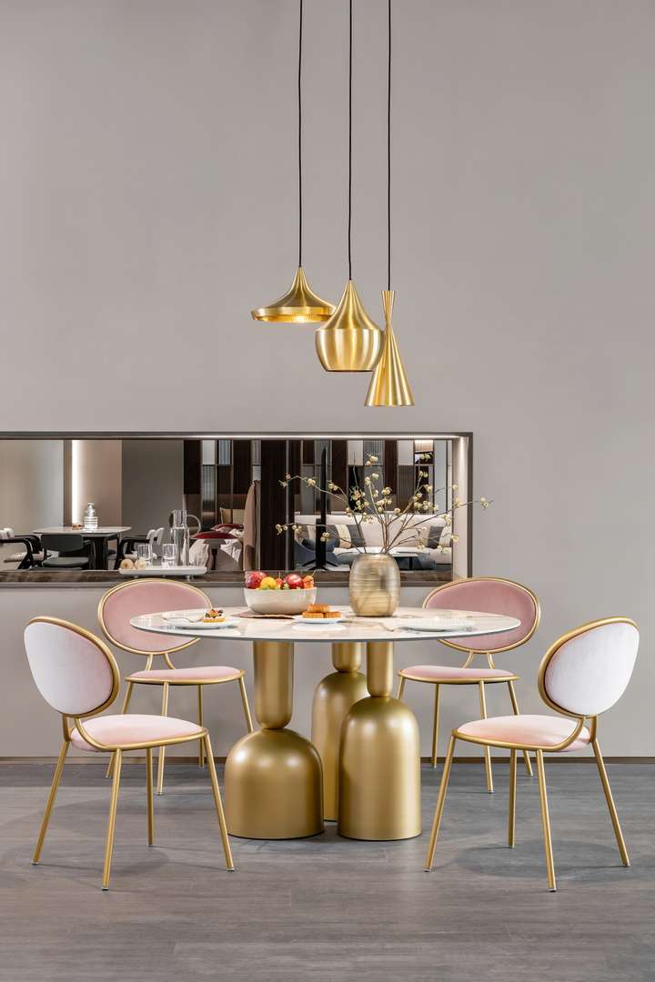 Cop系列餐桌将形态与功能、实用性与想象力、优雅与趣味达到巧妙平衡。底座的设计灵感来自于红酒杯、香槟杯等不同酒杯的轮廓,搭配活力粉色餐椅,不落俗套亦可收获一室雅致细腻。
