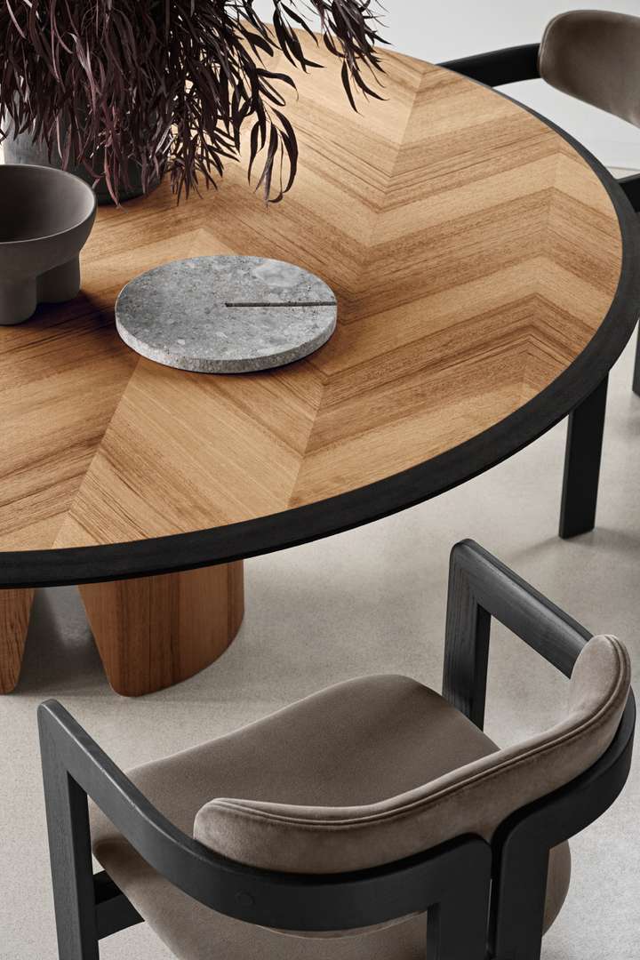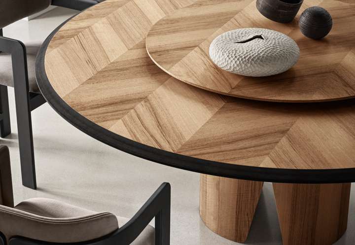 MANTO系列餐桌,台面采用胡桃木实木贴面镶嵌细致工艺,由鱼骨式拼接而成。朴素的木纹肌理,是空间最好的装饰。