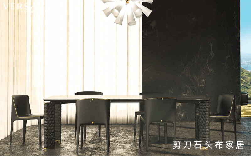 餐厅空间,V–Marble餐桌桌面呈现悬浮效果,桌腿采用v字绗缝工艺,底部以金属点缀,优雅耐看。搭配的Medusa Trono餐椅背部采用拉链风格设计,其中的美杜莎吊坠更加凸显精湛的做工。
