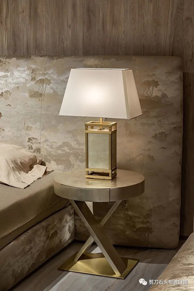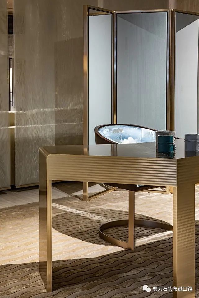 硬朗几何形金属书桌,以2色相间的条纹呈现柔和的光泽变化。床榻则用温暖的浅金色锦缎,描绘山林、薄雾的诗意景致。ARMANI/CASA的金色含蓄而精妙,轻柔地撩拨人心。