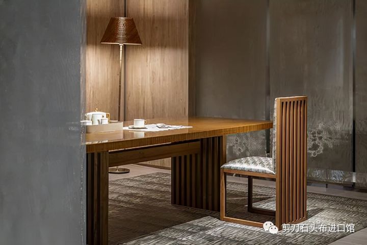 如玉石般莹润的灯罩,描绘出缥缈的氤氲之气,以ARMANI/CASA特有的秸秆细木工艺打造的台面,光线下折射的金棕色调,仿佛秋收丰景。