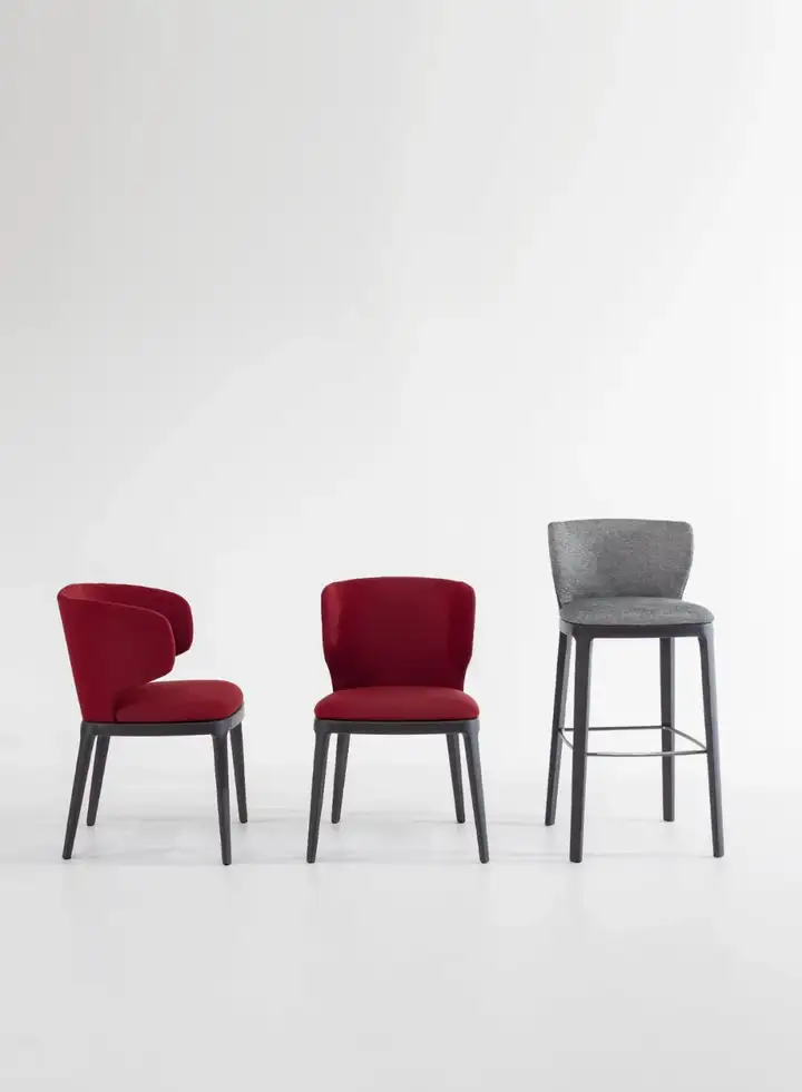 Mida系列产品包括无扶手椅( Mida )、扶手椅( Miss Mida )和两款不同高度的凳子( Mida too )。