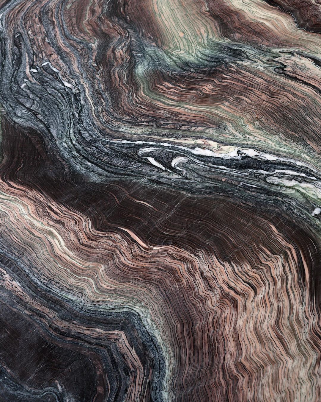 Ronchamp餐桌的大理石台面,自然纹理如海浪般美妙,艺术感超强。,但近距离观察会发现它不同寻常的原始结构。沁绿水色融入了清新淡雅的玫瑰粉、灰棕色与铁锈红……等成千上百种色彩。