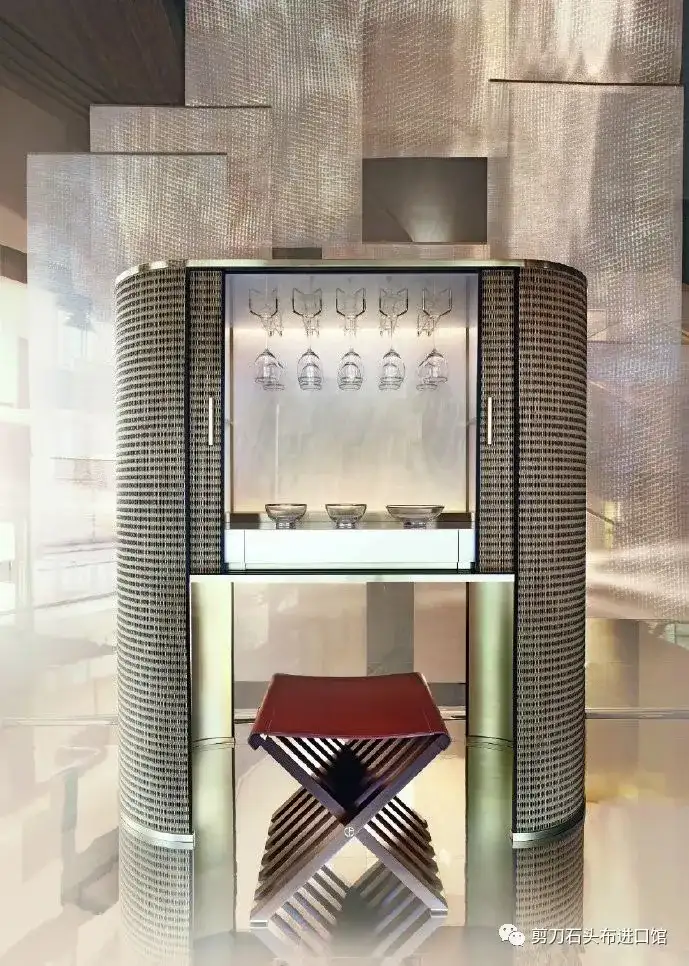 ARMANI/CASA限量版酒柜Royal,柜体特殊的编织纹理和珍珠母贝漆面效果,将大自然的氛围带入新年的家中,以其不同寻常之美,反映了与东方文化的紧密联系。