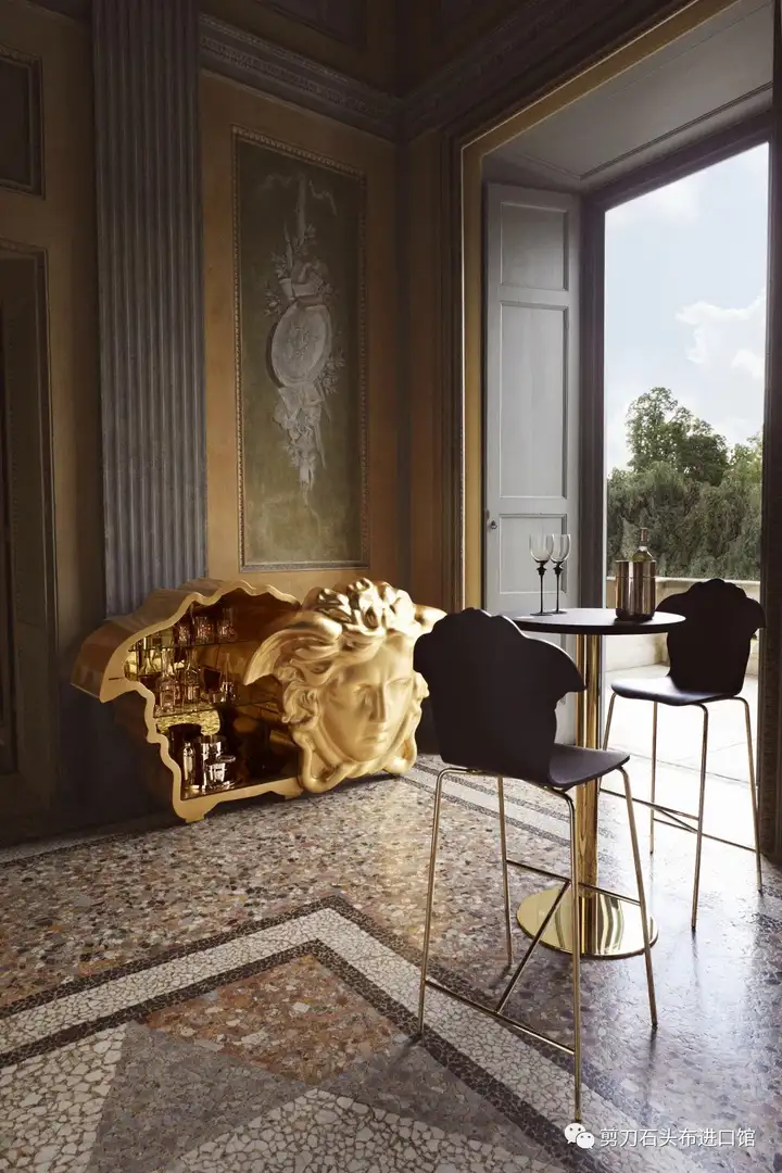 美杜莎浮雕的金色酒柜美轮美奂,精致优雅,华丽交错,内敛奢华浑然一体,点亮细节间的鎏光魅力。