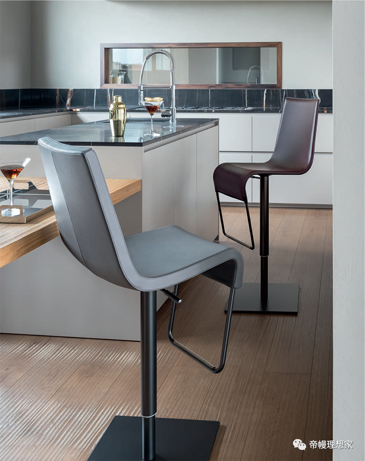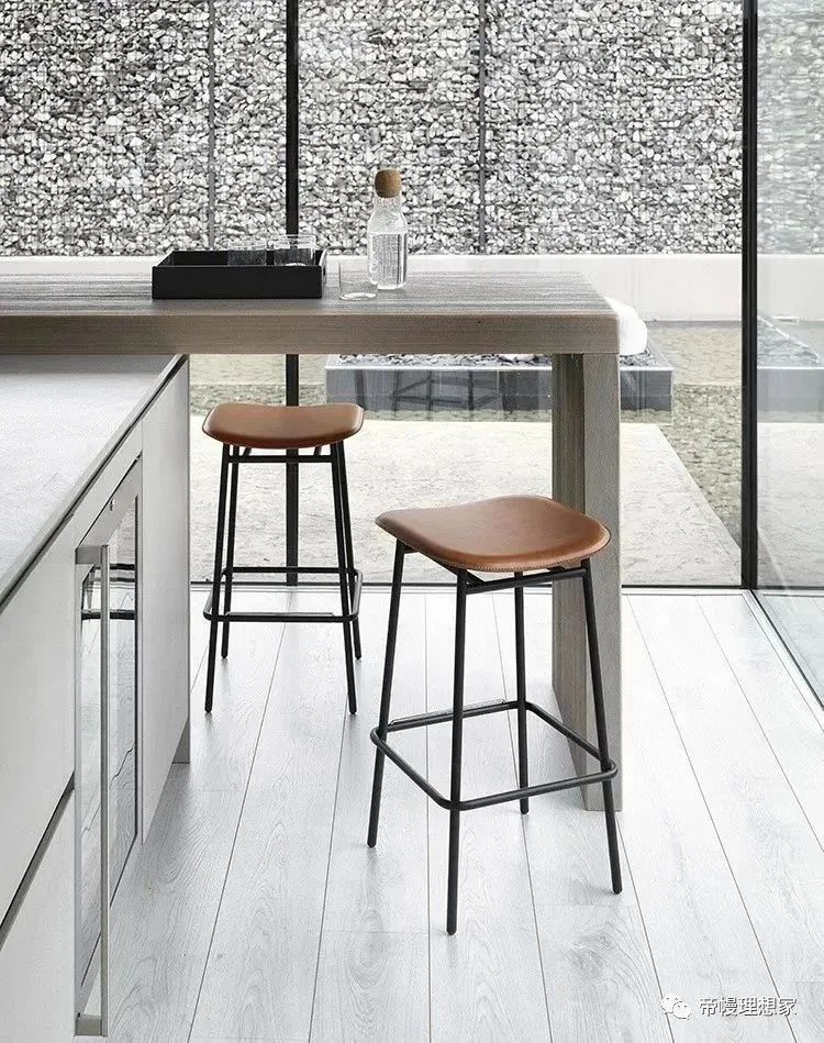中岛台的样式丰富,可根据使用需求,在硬装时就规划、定制。而中岛台的标配,无疑是高颜值的吧椅和小推车。