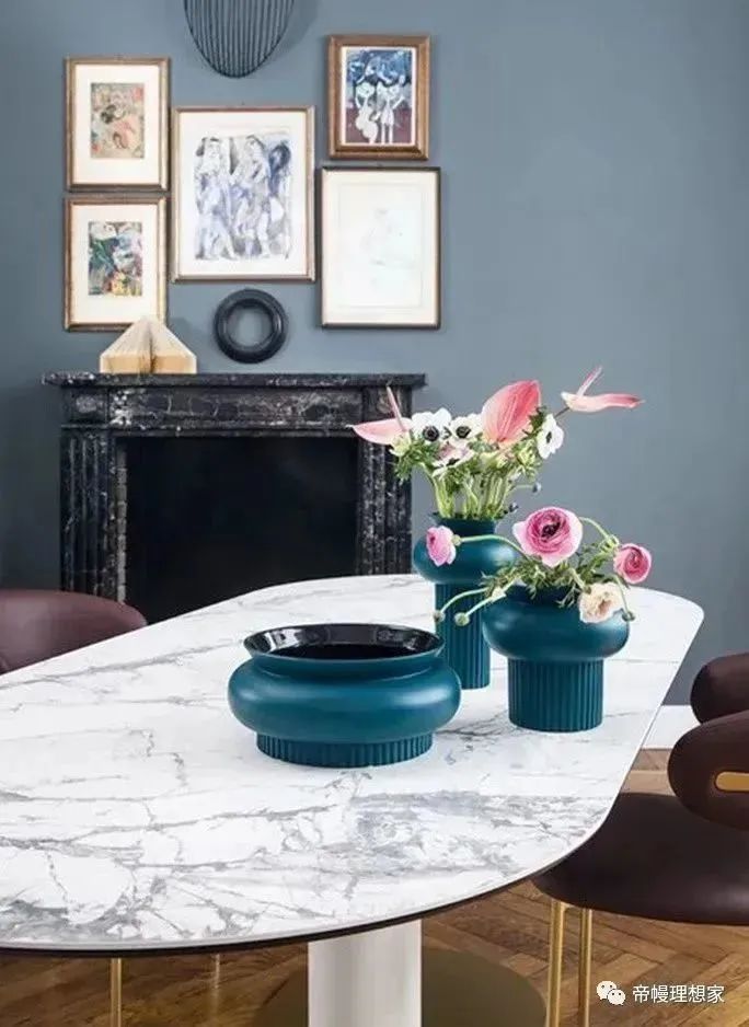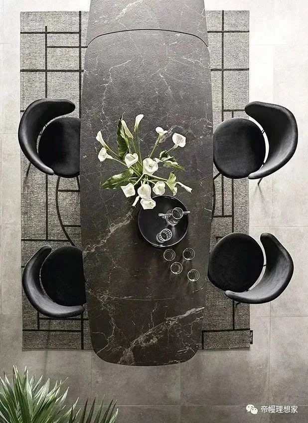 如广袤星河的大理石,纹理神秘深邃。即使搭配简单的白瓷盘,随手拍也张张大片。深色大理石质地坚硬、耐用,且不易渗透污渍。