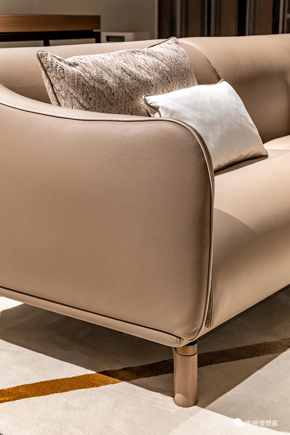 沙发扶手微微外翘,曲线流畅,动静相宜。柔和的奶茶色搭配细腻的牛皮,由内散发出来不动声色的Luxury感。