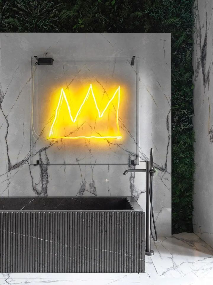 酷黑的大理石浴缸,墙上的壁灯仿佛是一个装置艺术作品,像一座山、一顶王冠、一簇火苗,任想象力驰骋,超级浪漫。