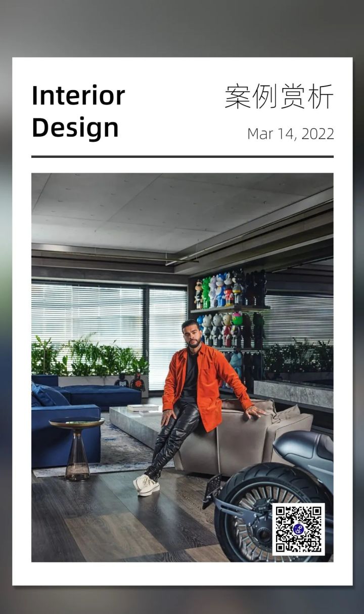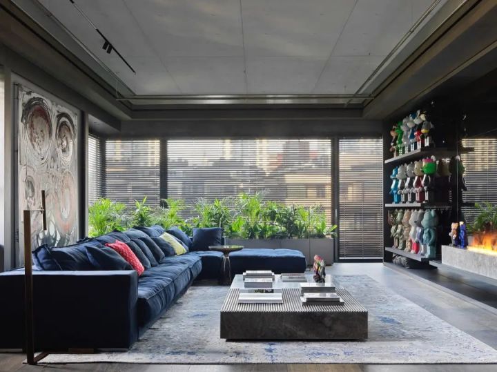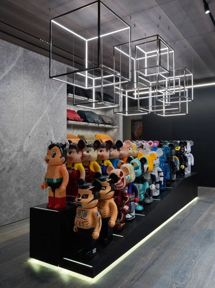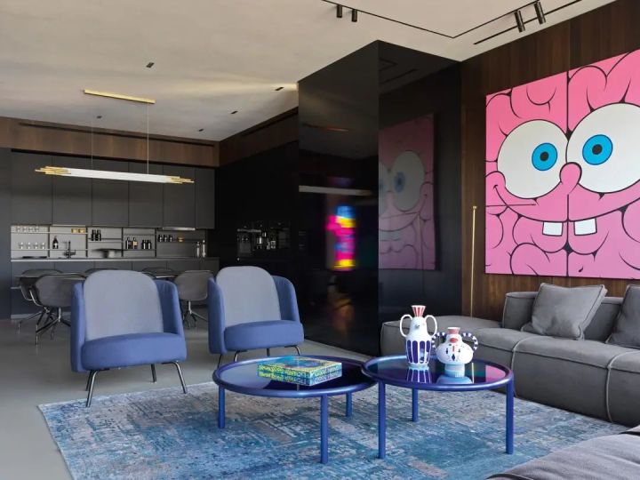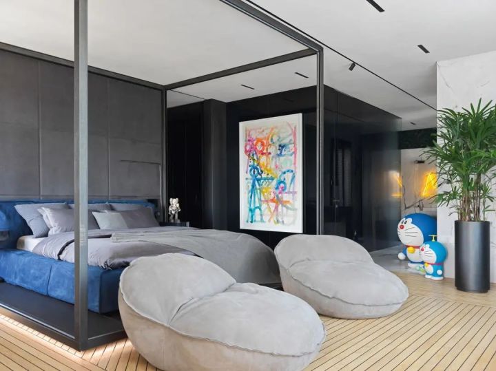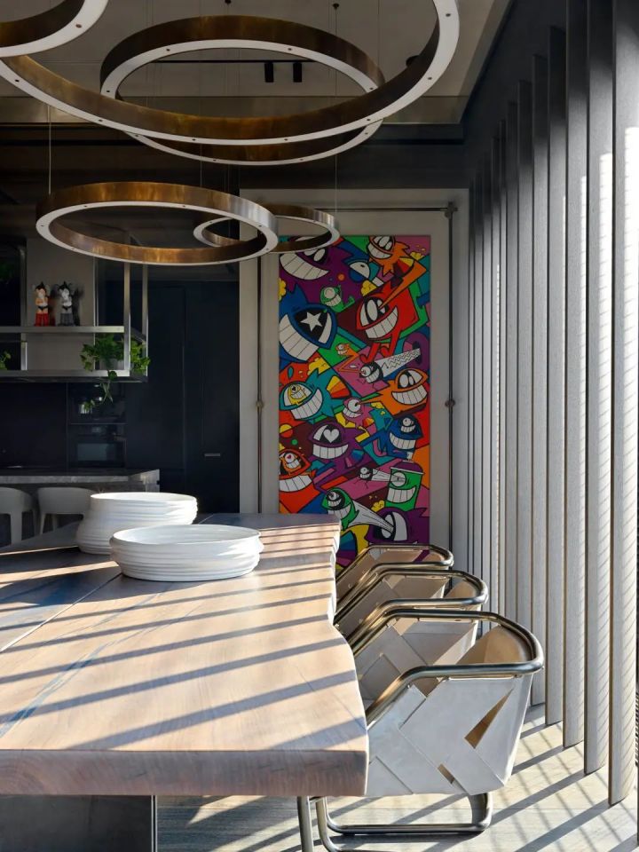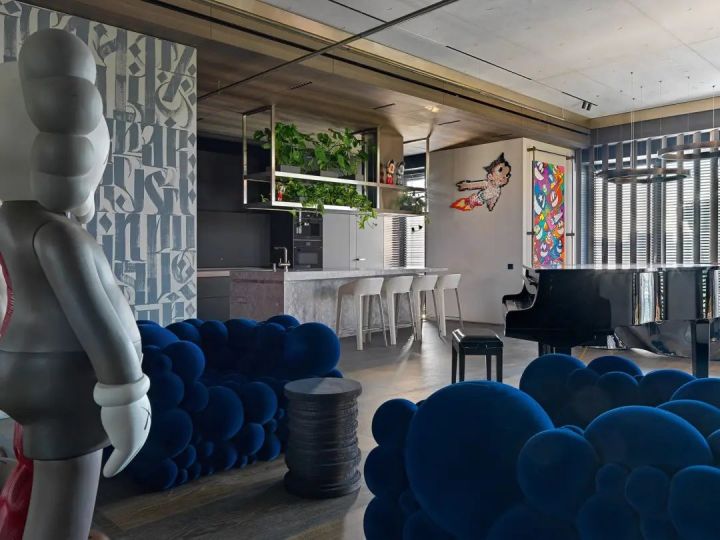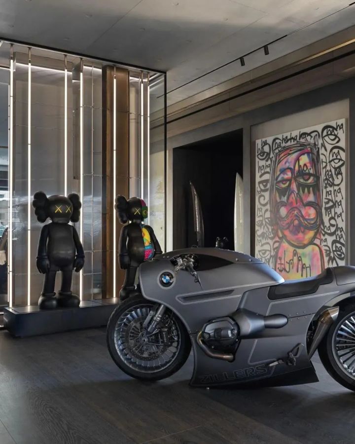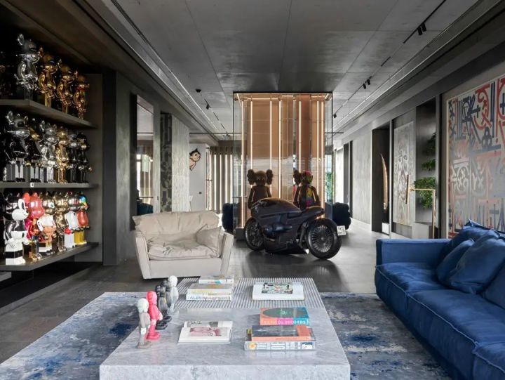 客厅正中的玻璃装置,展示Kaws雕塑,也是一个巧妙的隔断。赛博朋克风的Zillers Garage摩托车与限量版积木熊、现代艺术挂画,和谐共处,呈现出主人澎湃的热情。