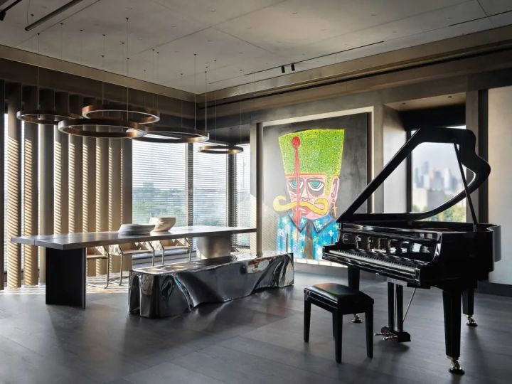 餐厅里摆放了一架经过修复的齐默尔曼三角钢琴,搭配整面墙的当代艺术作品,艺术气息浓郁。屋主尤其喜欢坐在阔大的餐桌边和朋友聊天。