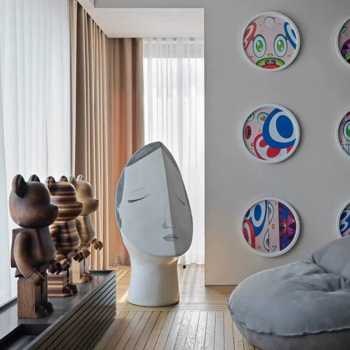 睡眠女神雕像和村上隆的一组圆形挂画,显得轻松柔和,色彩清新愉悦,适合睡眠空间。