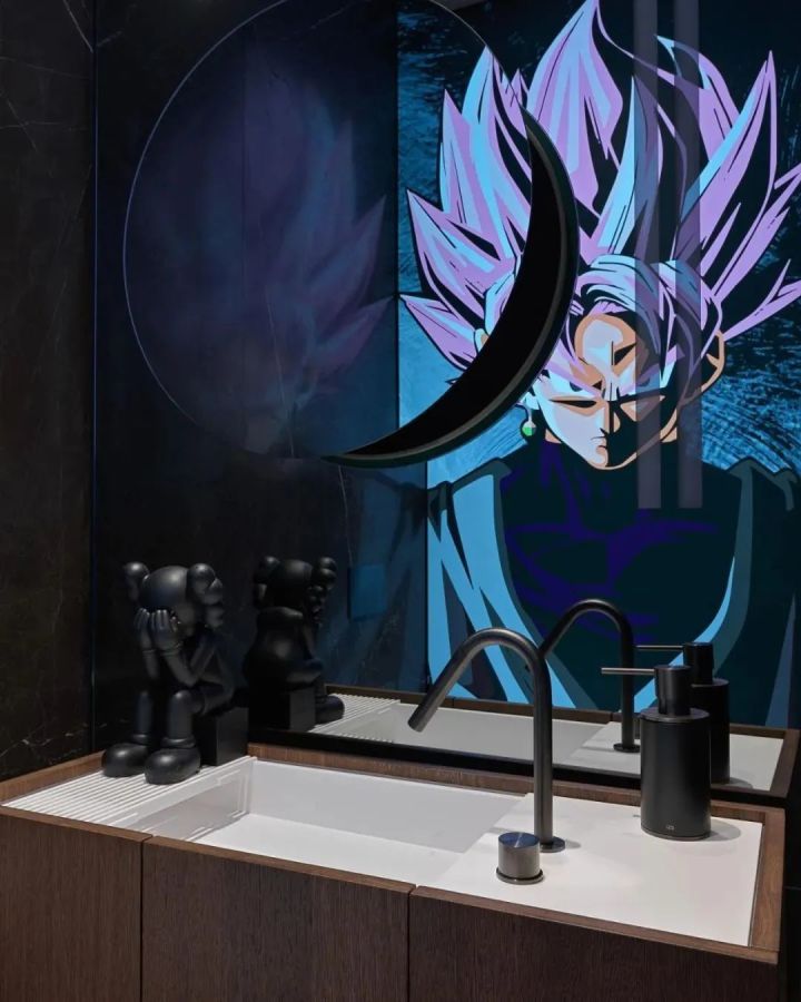 连主卧洗手台都蹲坐着Kaws的限量手办。屋主是日漫《龙珠》的粉丝,洗漱时,一抬头就能看见他的英雄。