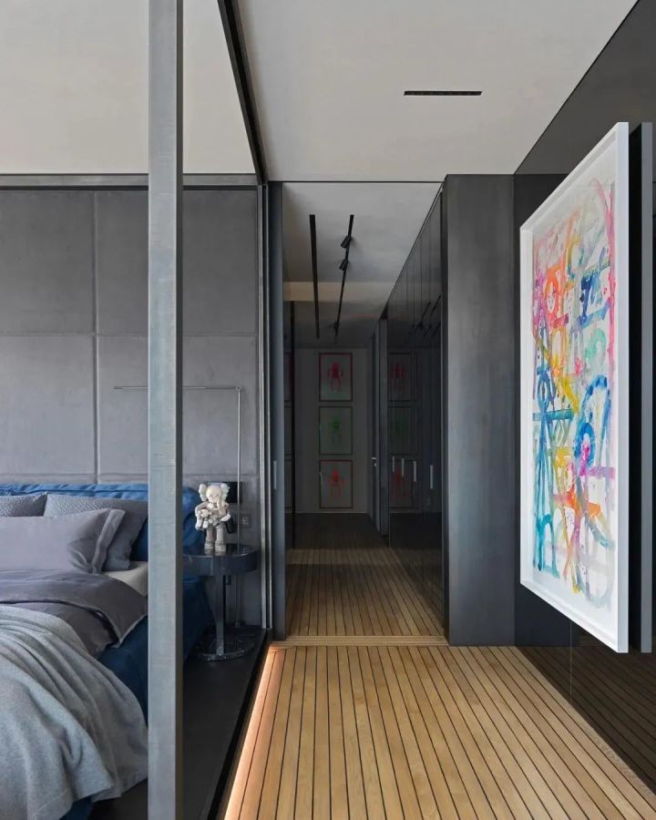 主卧同样陈列着各种当代艺术画作和艺术家雕塑,童心与热烈并存。主角却是一张BAXTER的舒适皮革大床,与艺术品共处一室,气场丝毫不输。