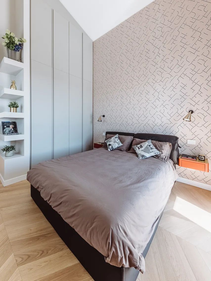 迷宫图案的灰粉色壁纸+雾霾蓝色顶天立地的衣柜,气质柔和,甜度适中。最令人心仪的,还是靠背超软的皮革大床,舒适度和安全感满分。