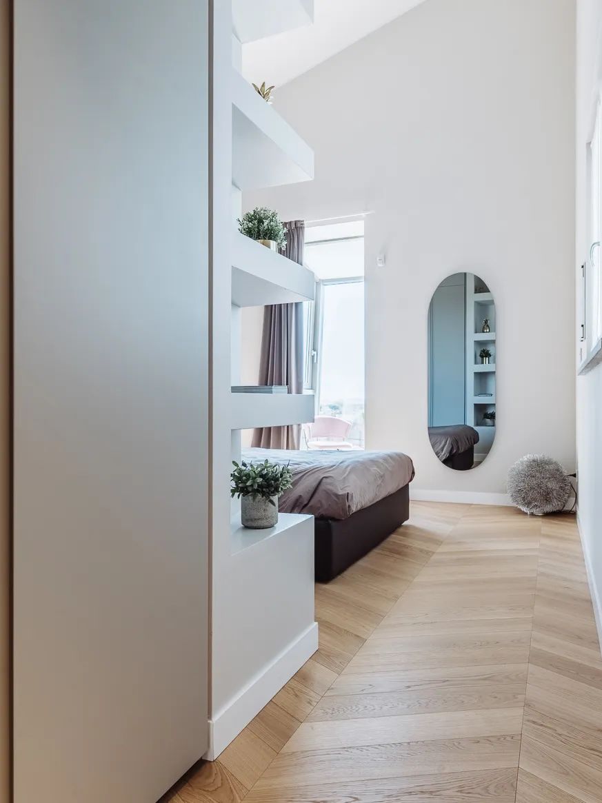 在卧室门口,就能看见摆满植物的装饰架、椭圆穿衣镜和软萌的毛绒坐凳,每一件都充满了温柔细腻的生活气息。
