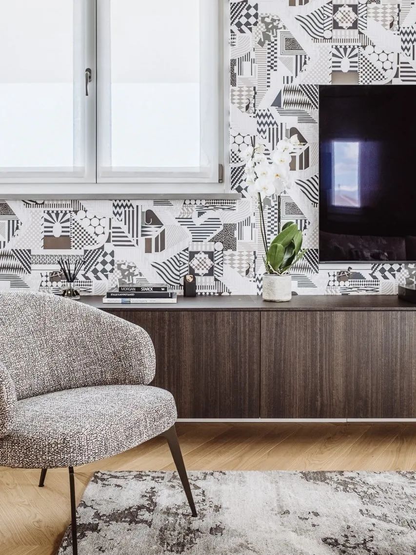 电视背景墙壁纸的黑白花纹,不张扬却意趣丰盈,打破了白色的沉静,一种含蓄的俏皮感悄然而至。