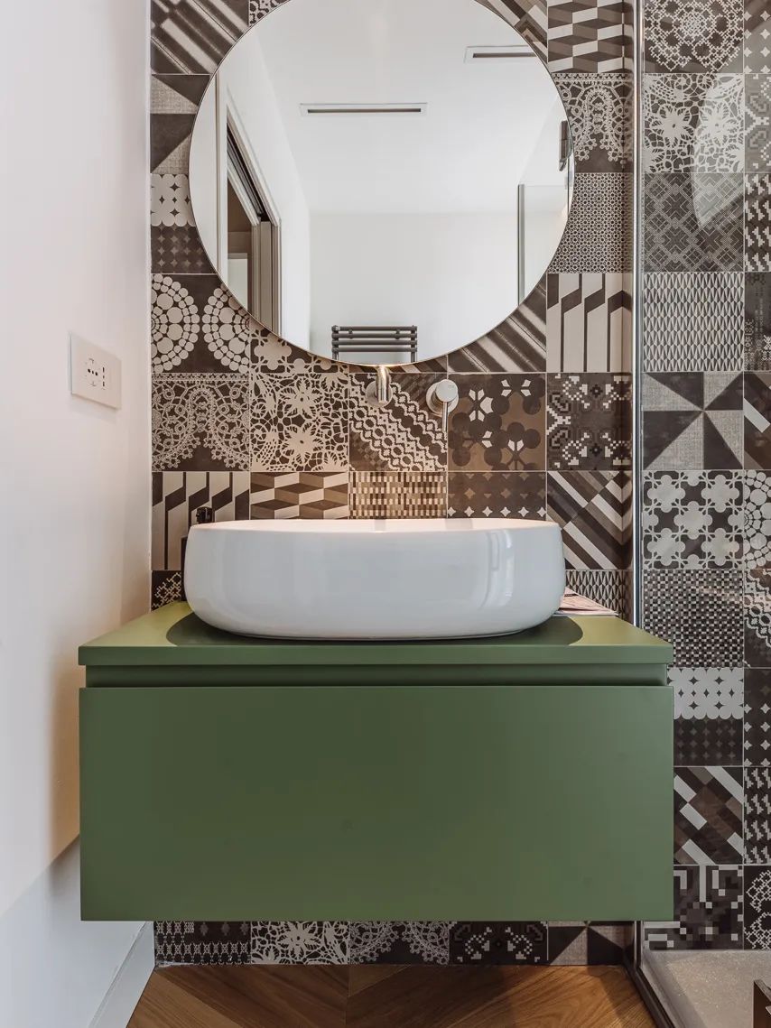 二楼卫生间是完全私人的空间。鼠尾草绿的洗手台柜+整面花砖墙,配色时髦,美得不落俗套,是主人最满意的空间之一。