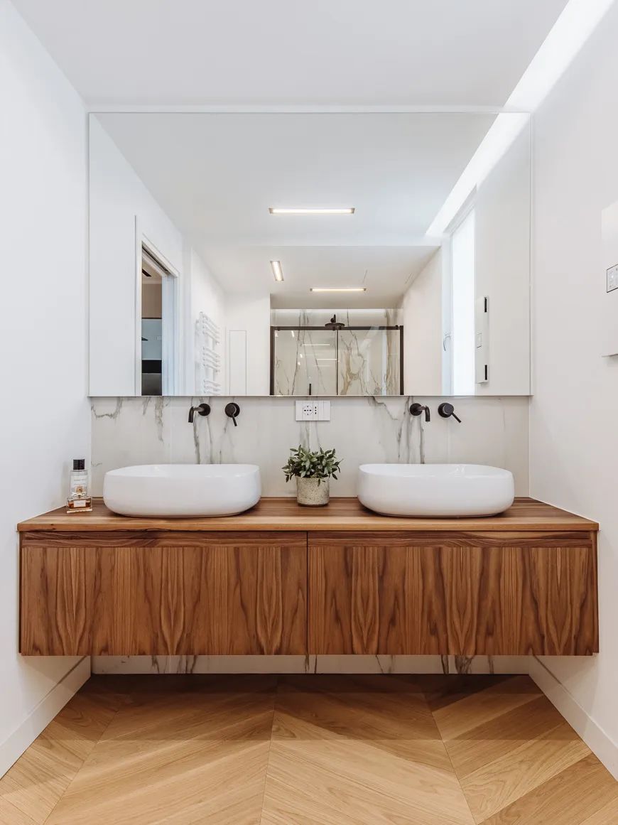 一楼的卫生间采用了双台盆设计。木质台盆柜的自然感和香氛的都市感,达成了微妙的平衡。