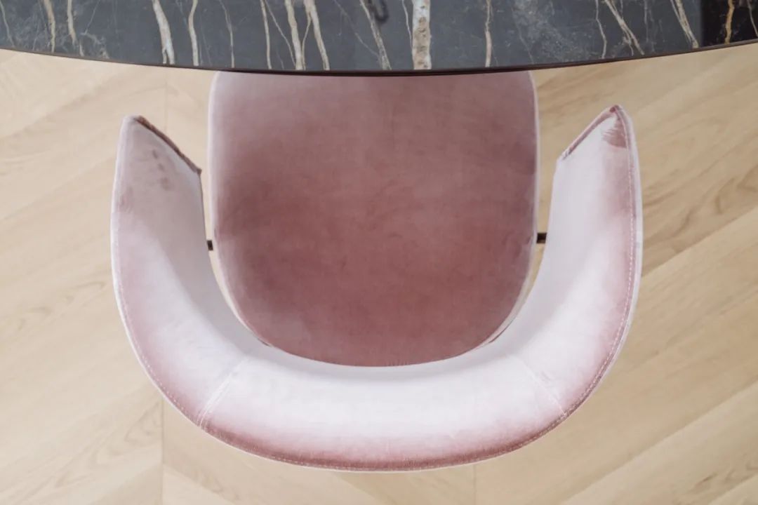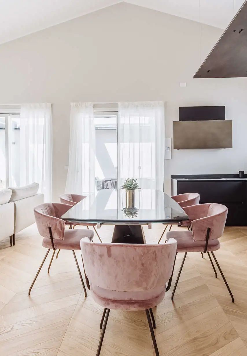 餐厅区域最吸引人的是粉色丝绒的餐椅。搭配X型底座的大理石餐桌,又优雅又俏皮,甜美少女心得到了大大的满足。无论是日常一个人吃饭,还是招待朋友,氛围感都能拉满。