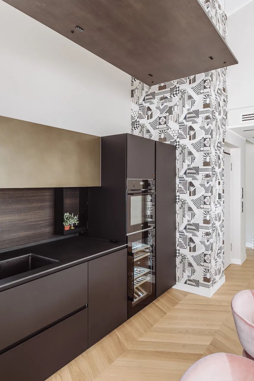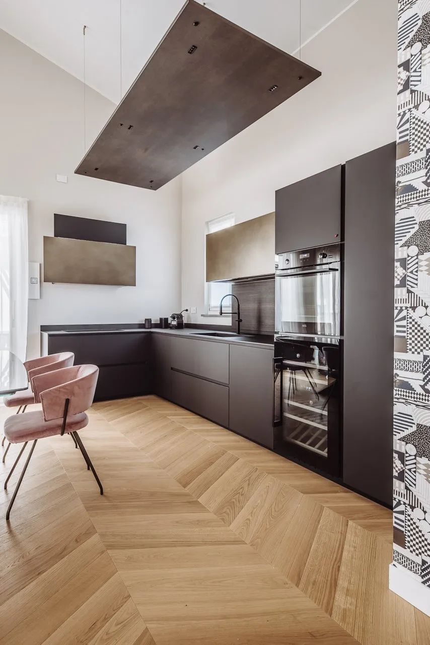深色系开放式厨房位于一楼空间的一角,最高的地方高达5米。设计师经过精心设计,同色系的照明系统从高处垂挂下来,既丰富了空间层次感,又非常通透。