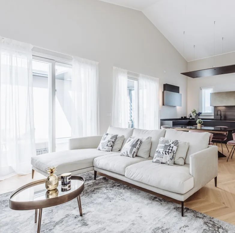带贵妃位的白色转角沙发,清新简约时髦,是客厅里无可置疑的主角。主人无论躺着坐着还是趴着,都又舒适放松,又有型。